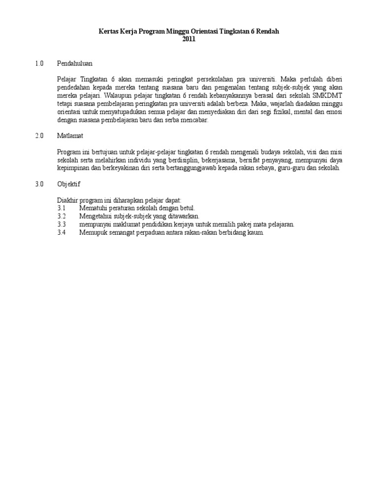Kertas Kerja Program Minggu Orientasi Tingkatan 6 Rendah Pdf